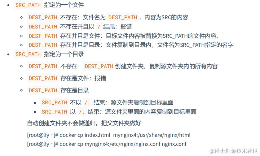 docker cp [OPTIONS] CONTAINER:SRC_PATH DEST_PATH|- :把容器里面的复制出来