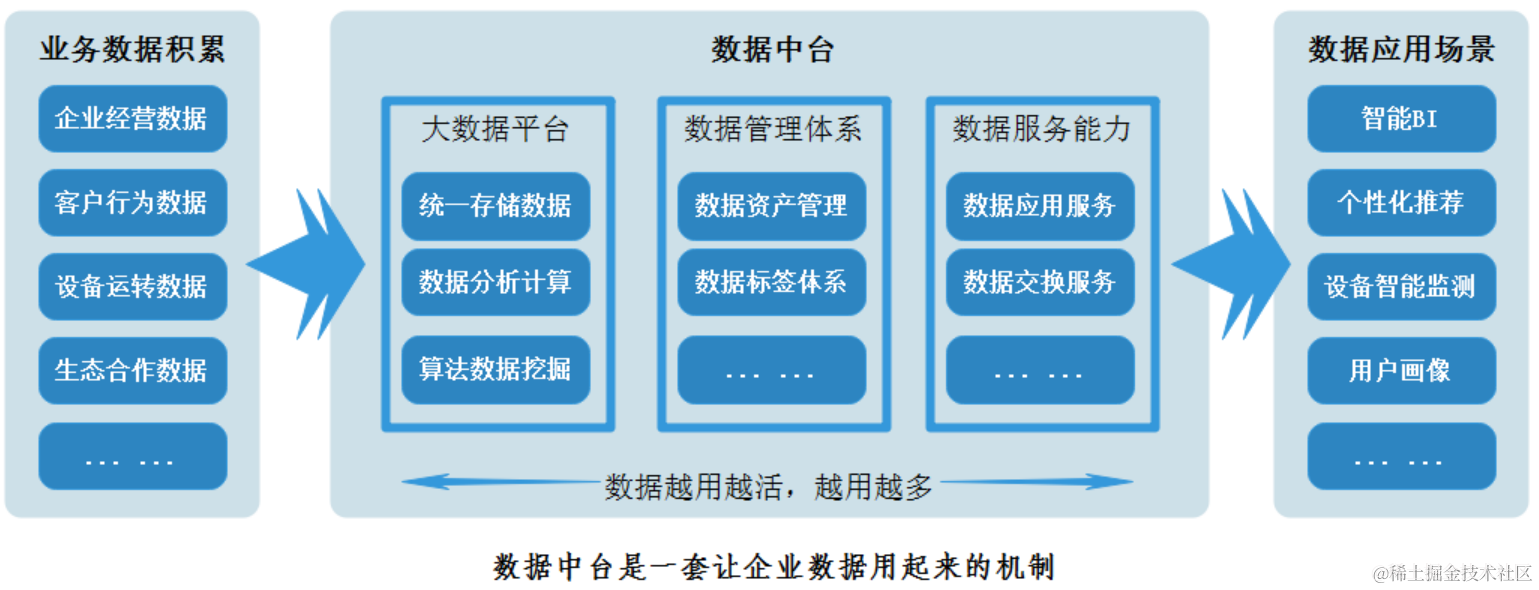 如果我们把数据比喻成血液,那么数据中台就是心脏和毛细血管,构建中台可以能让数据价值渗透到各个业务场景中去。