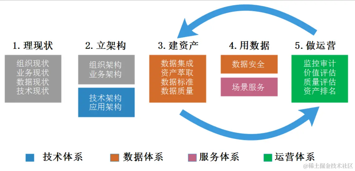 运营主要包含数据监控审计、数据价值评估等内容,通过数据运营,让更多的人和业务感知到数据的价值。数据中台构建稳定之后,一般会循环3~5步骤,不断挖掘数据和业务场景的结合点。