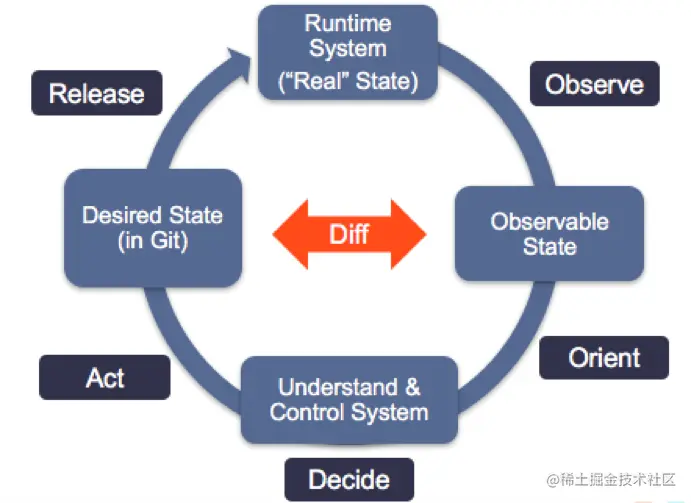 在“GitOps”模型中,使用Git来解决分歧以及收敛状态,并借助一组“diff”和“sync”工具(kubediff[5],以及terradiff和ansiblediff)来比较预期状态和实际状态。