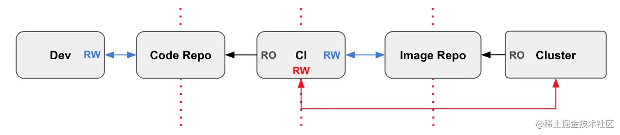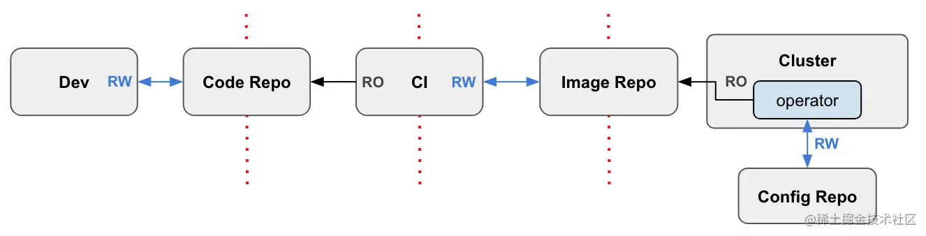 我们不希望使用CI系统触发部署或在命令行上手动进行部署的原因是,这可能需要在集群外公开验证凭据。虽然可以同时保护CI/CD脚本和命令行,但在集群的信任域之外工作,通常不是良好的实践,这就是为什么CI系统可以被认为是生产系统的攻击媒介。