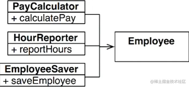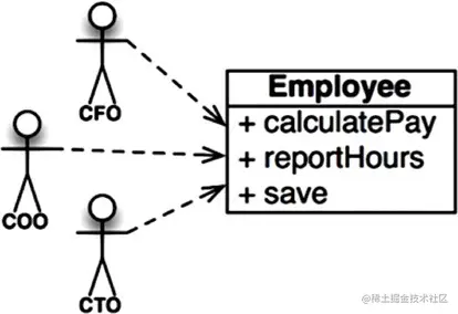 《Clean Architecture》中提到的例子是Employee,其中Employee这个类里面包含了3个方法,calcuatePay()由财务部制定,向CFO汇报;reportHours()由人力资源部制定,向COO汇报;save()由DBA制定,向CTO汇报。这3个函数【实现】在同一个类Employee中,这导致任何他们一方修改逻辑有可能会影响到其他部门,这样Employee从设计角度涵盖了多个责任,不符合SRP原则。