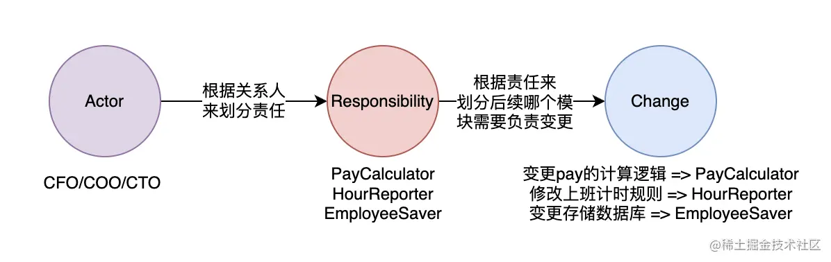 在这个经典例子中,从程序猿角度看Employee的3个功能计算工资、汇报工时、存储,但我们划分的依据是看这些功能对应负责(responsibility)的actor,比如这里是CFO、COO、CTO,这些actor的需求就是该模块后续修改(change)的来源。需要注意具有功能跟responsibility是不同概念: