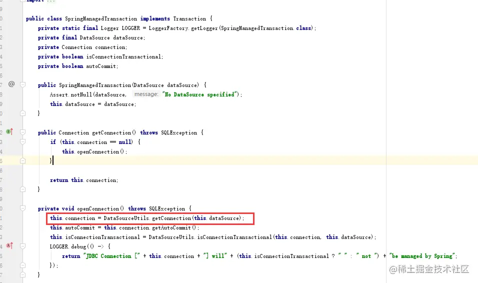 后续针对mybatis查找了相关资料,事务控制默认实现是SpringManagedTransaction,源码查看后发现了熟悉的DataSourceUtils.getConnection,证明我们的分析方向是正确的