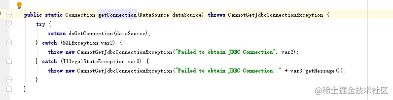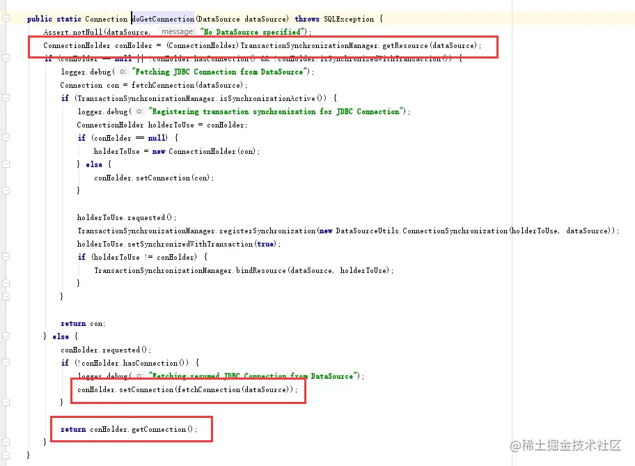 通过断点调试会发现sql语句的执行最终会落到execute方法,方法中开始就是通过DataSourceUtils.getConnection获取连接,这里就是我们需要追踪的地方,点进去发现跳转到doGetConnection方法,这里面就是我们需要分析的具体逻辑