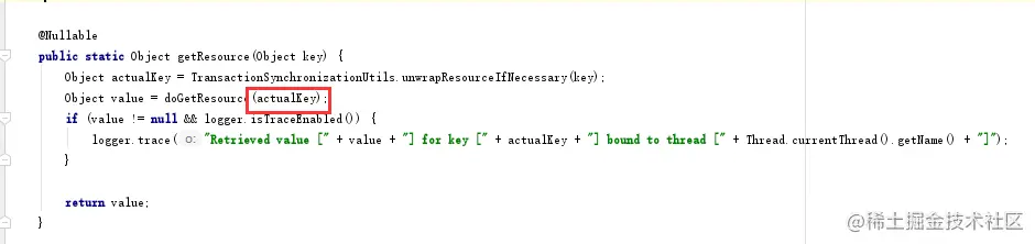 第一行获取的ConnectionHolder就是当前事务对应的线程持有对象,因为我们知道,事务的本质就是方法内部的sql执行时对应的是同一个数据库connection,对于不同的嵌套业务方法,唯一相同的是当前线程ID一致,所以我们将connection与线程绑定就可以实现事务控制
