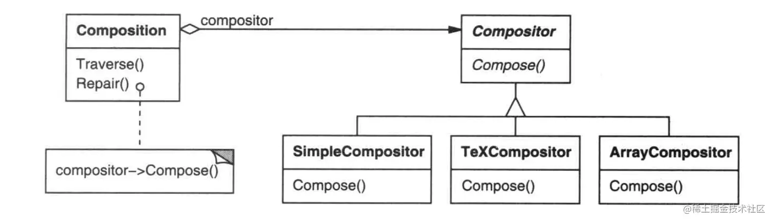 - ConcreteStrategy(具体策略,如 SimpleCompository , TeXCompositor)