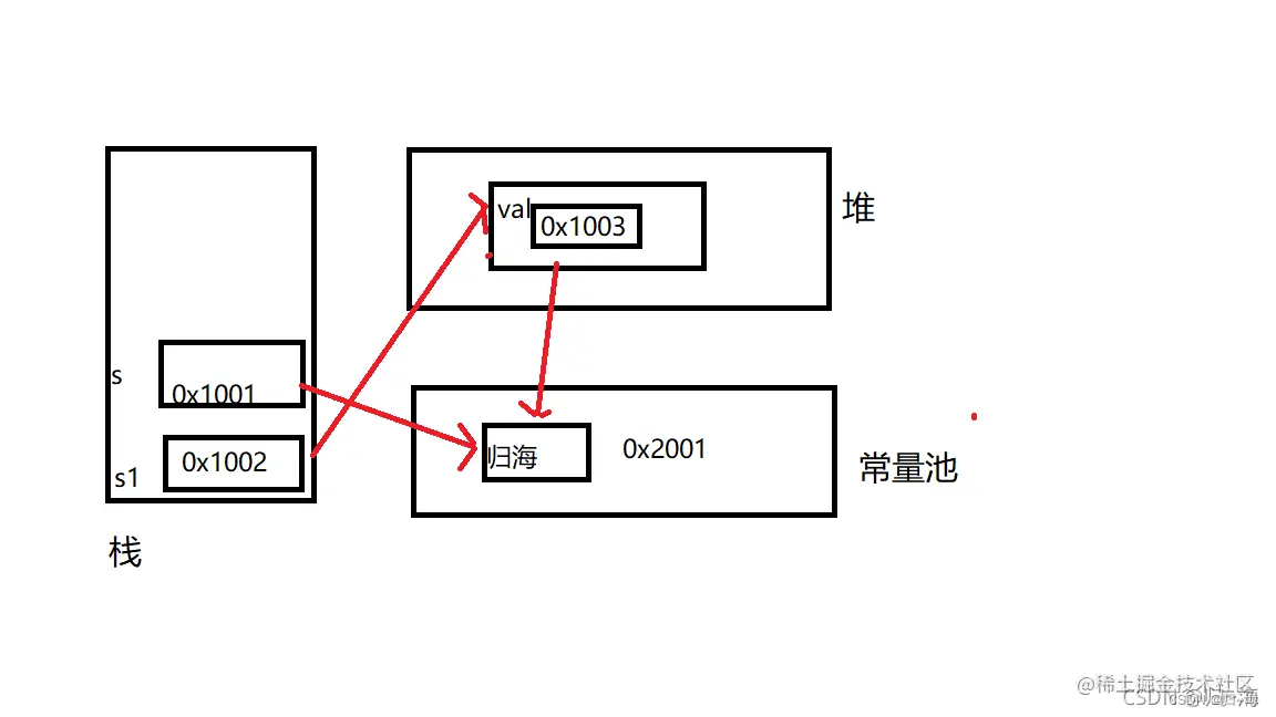 这种方式则是先在堆中创建空间,里面维护了value属性,指向常量池的"归海"空间。如果常量池中没有''归海'',则重新创建,如果有就直接通过value指向。注意这里最终指向的是堆中的空间地址。