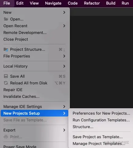 先来找到入口,在File菜单中找到New Projects Setup菜单项,细节如上图所示: