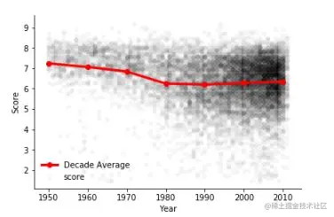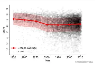 我们用GroupBy 就可以很方便的将电影按年代分组看一下每个年代的平均分