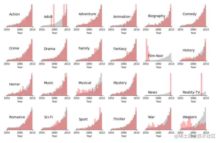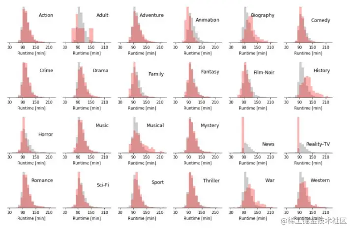 接下来我们按照流派划分数据,看看发行时间,时长,评分是如何分布的。 全部电影数据的分布作为灰色背景展示。