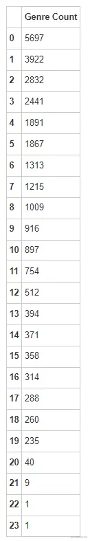 然后,我们对一些行或列,使用聚合函数如 sum 进行分析,看看哪个流派出现的频次是最高的?