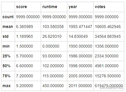 随后对流派信息进行分割我们可以使用指示变量的概念将流派列分割成许多列。每个新的列将对应于一个单一的流派,每个单元格将为True或False。然后我们再从名称里把年份信息移除掉可以通过移除最后7个字符的方式实现完成数据清洗之后,我们就可以着手探索全局特征啦~首先,通过describe方法来了解
