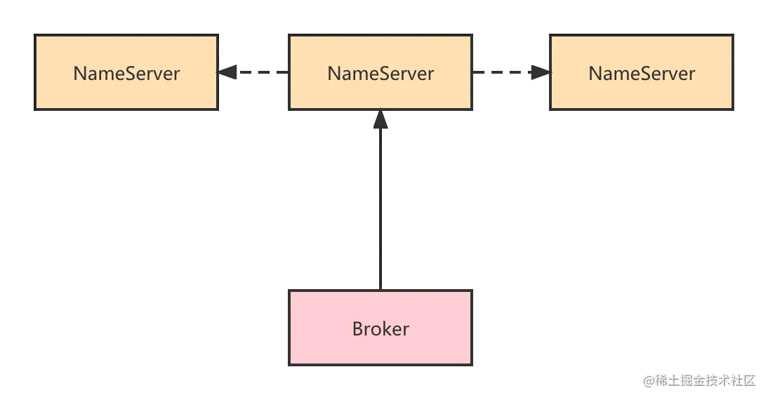 Broker启动的时候只向某一台NameServer进行注册,立马返回,然后NameServer之间再进行相互同步,Eureka就是使用的这种方式。