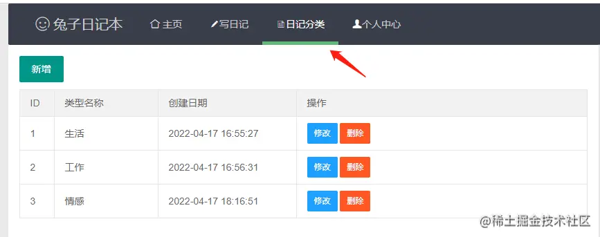 大概意思呢,就是用户只能删除自己的日记类型,而且如果已经有了该类型的日记,则不允许删除。 哦对了,我们还需要做一下日记分类的菜单选中效果。