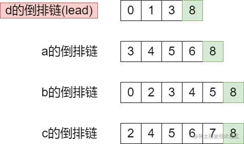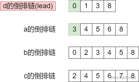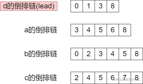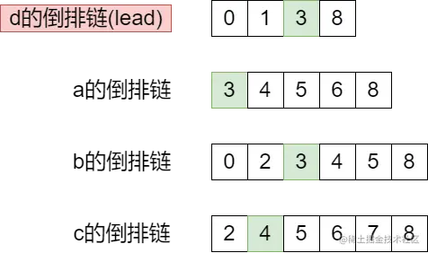 所以,在算法执行之前,我们要对所有的倒排链按照长度排序,取最短的倒排链作为处理中心(倒排链d),我们称它为lead: