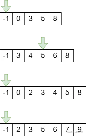 因为倒排链DocIdSetIterator其实是个迭代器,它只能往后查找,所以在算法处理之前,必须保证每一次查找开始时,所有的倒排链必须都是定位到相同的文档(DocIdSetIterator初始文档id都是-1)。想想如果对于如下图所示的倒排链,绿色箭头表示交集算法处理的起始位置,第二个倒排链中的文档3就被遗漏了,从而交集的结果少了文档3,这个限制也说明了整个ConjunctionDISI的交集算法执行过程中没有中间状态,只要还有匹配的文档,则当前的状态肯定是每个倒排链都在匹配的位置。