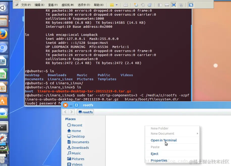 挂载U盘:把文件从电脑拷进虚拟机,再从虚拟机拷进U盘的两个去,BOOT里面是三个启动文件,rootfs里面是桌面系统linaro-o-ubuntu-desktop-tar-20111219-0.tar的解压问价,用命令符解压后输入管理员密码(密码不会显示),等大概半个小时,之前回车不会有东西,出现下图则虚拟机装进SD卡