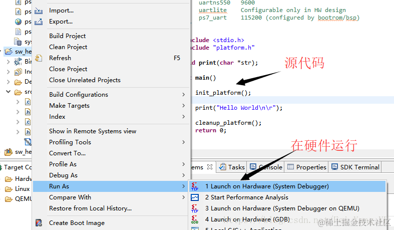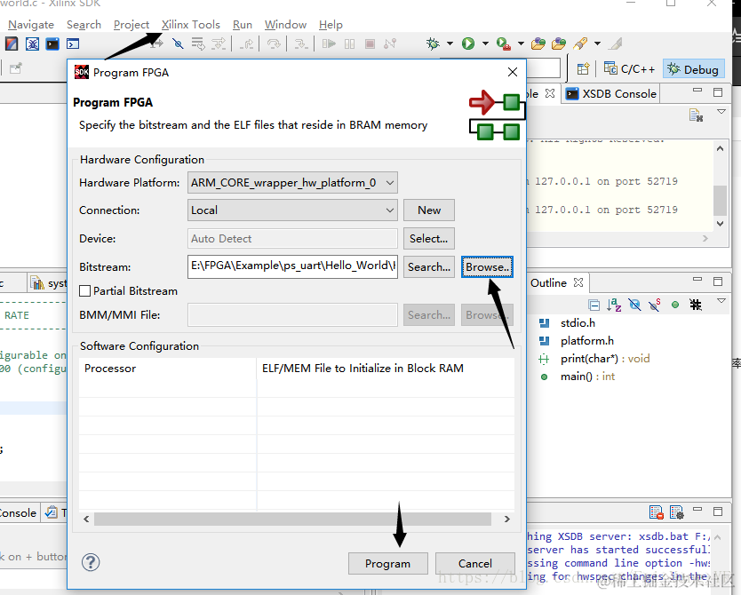 运行前一般先Program-FPGA(在Xilinx-Tools里面),流程如下图,选择比特流一般地址E:\FPGA\Example\ps_uart\Hello_World\Hello_World.runs\impl_1,因为处理器不是单独运行的需要FPGA上的一些逻辑配合运行,所以要Program FPGA,本实验用不到外部逻辑可以不执行这一步
