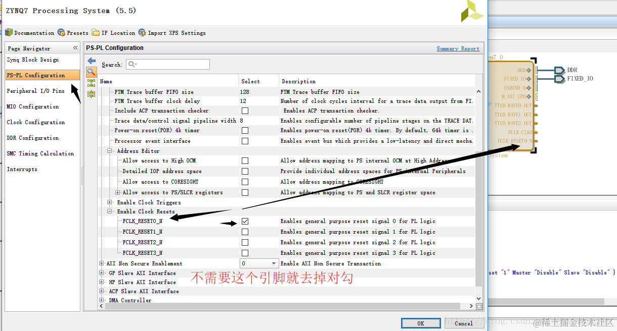 左面那栏里面,PS-PL那项选择完,就下一个Peripheral那栏只勾选UART1,其它去掉;再去Clock里面把PL项的时钟去掉 ;配置在DDR里面查看