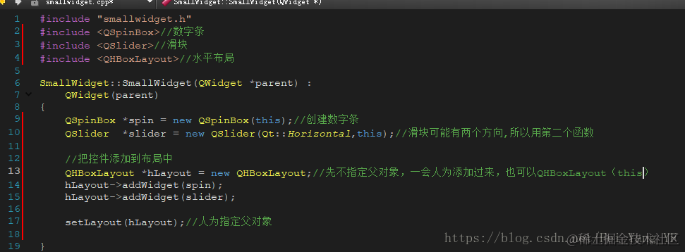 QHBoxLayout *hLayout = new QHBoxLayout;//先不指定父对象,一会人为添加过来,也可以QHBoxLayout(this)