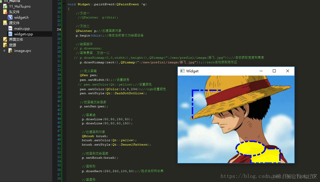 p.drawPixmap(rect(),QPixmap(":/new/prefix1/image/路飞.jpg"));//rect自动获取矩形区