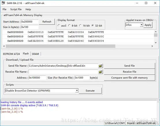 请选择usbserial串口,并选择at91sam7s64-ek开发板,按connect,则程序主界面打开