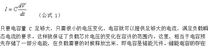 因为电容对于交流的“电阻”特别小,所以在负载芯片(7805)旁边并联一个电容,相当于在负载电流浮动时(相当于交流)将整个输出的电阻拉低(并联电容了嘛),这样根据U=IR,R减小,将U的浮动降至最低。另一方面,当负载要求的电流突变时,电压来不及响应,电容就会瞬间放出电流,起过渡。