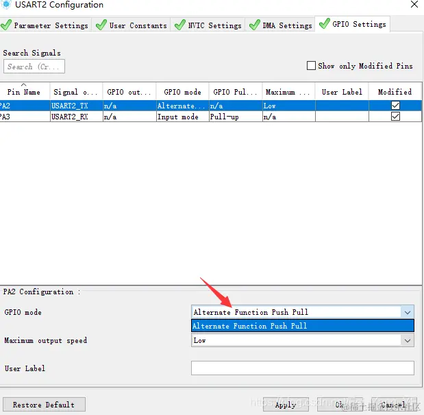 这个usart2的tx引脚模式默认只有pp一种,要改成OD模式,可以直接在源程序里面改,注意再次生成后,需要再次修改