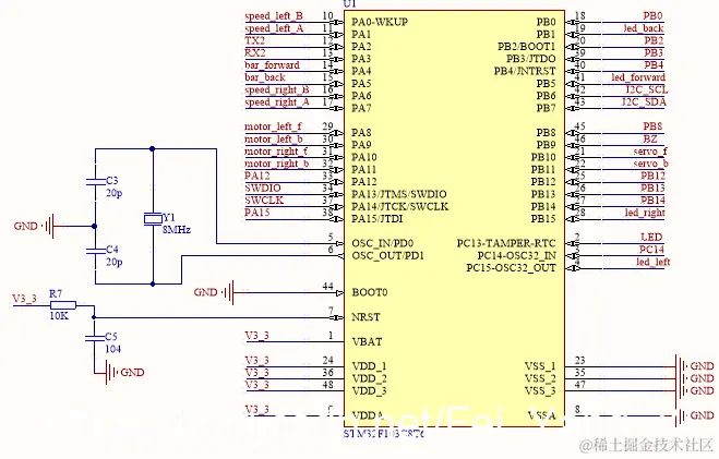 毕设+电路板(BTN7960驱动电路+LM2596/AMS117稳压电路+蜂鸣器+STM32F103C8T6最小系统电路) Sky_Lannister 2022-05-02 313 阅读1分钟 BTN7960驱动电路: LM2596/AMS117稳压电路: 蜂鸣器: STM32F103C8T6最小系统电路: 注意:蜂鸣器驱动电路在主芯片是8051或STM32情况下不太一样,因为有的驱动电路工作只能工作在5v以下 驱动电路用的引脚多的话,可以加一个74LVC245 电压转换是12-5-3.3V 电路板要求最小孔径大于0.3mm,否则有的工厂加钱