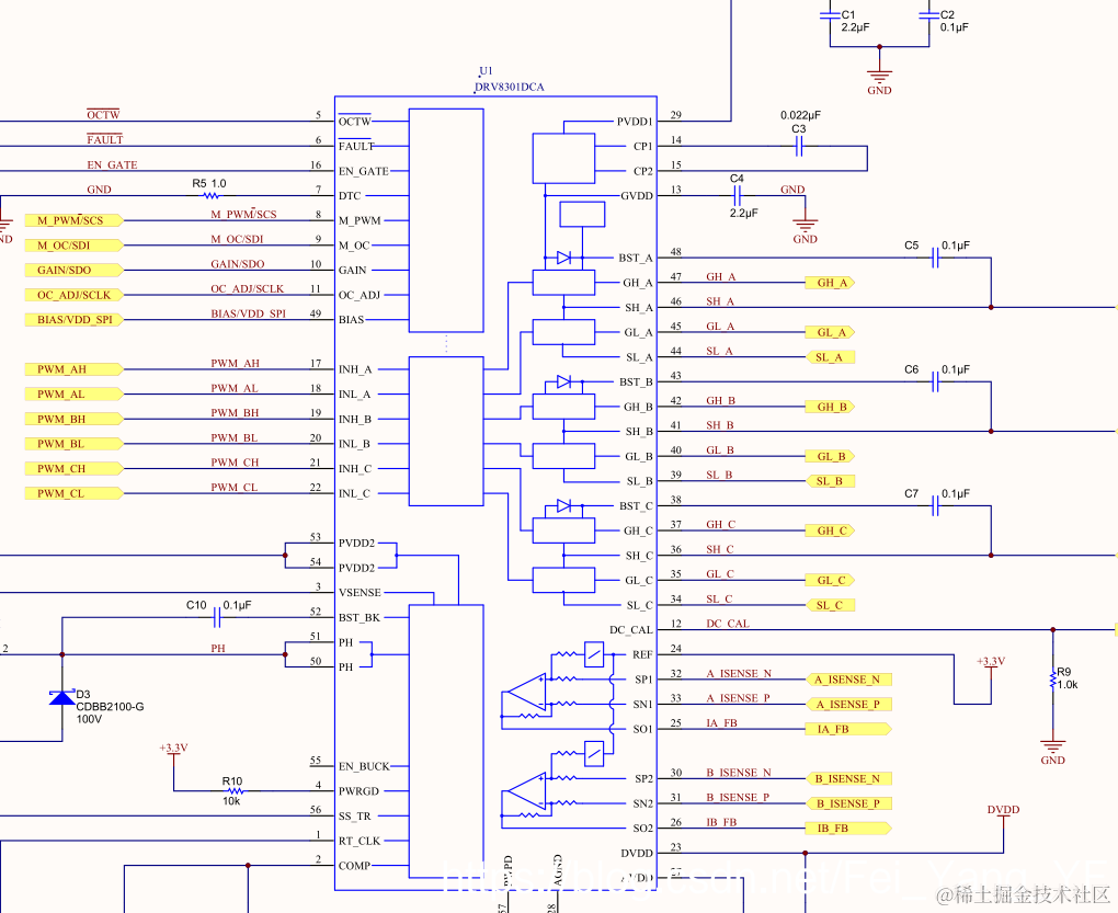 GVDD 为内部栅极驱动器稳压器的电压输出。电容 C15 与 GVDD 引脚相连。将 GVDD 电容连接到 GND。