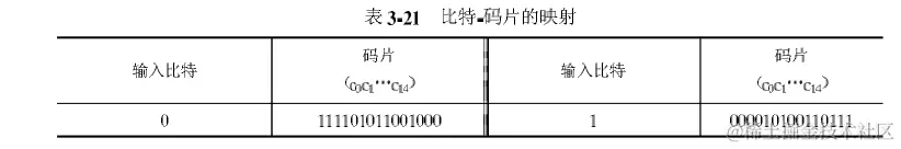 比特-码片映射:每一个输入的比特位都映射成15位的PN序列,如下图