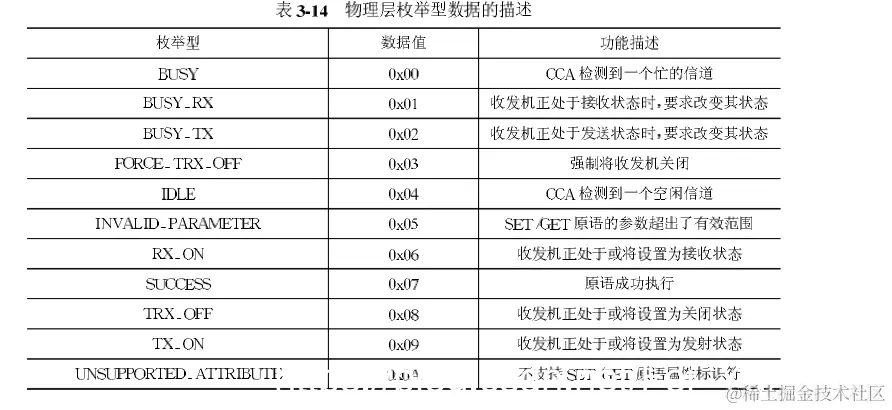 PD-DATA.confirm:物理层数据确认原语,物理层用此向MAC层报告向对等的MAC层发送MAC层协议数据单元的结果状态,为PD-DATA.reques的响应,参数是一个枚举型的参数