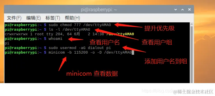 树莓派4串口默认给终端调试用,切换到硬件串口,硬件串口默认给蓝牙用,再切换到引脚用,切换后应用权限又不够,sudo chmod 777 /dev/ttyAMA0,提高权限后,发现重启后权限没了,最好设置永久可操作,sudo usermod -aG dialout pi 网上大部分都是dialout 因为是USB0, 但是 ttyAMA0用户组是tty,最后还要把用户名加入tty用户组