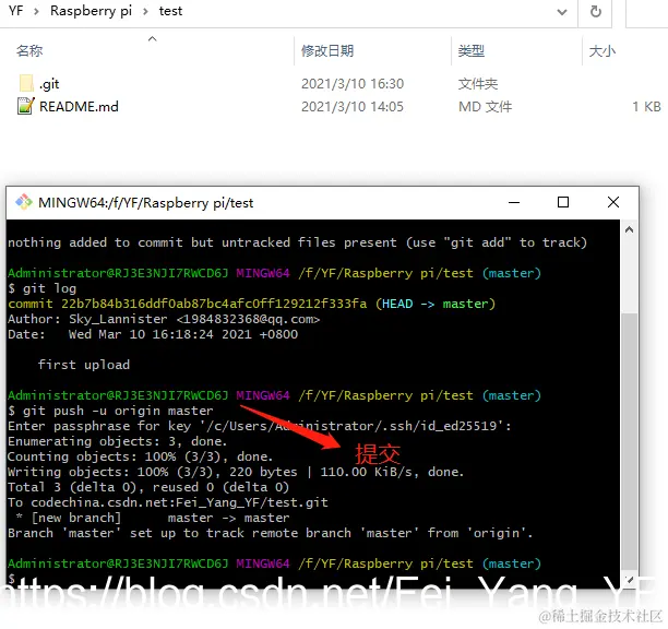 然后提交到csdn项目区,中间输一次密码(具体参考第一个截图中的命令行指引)