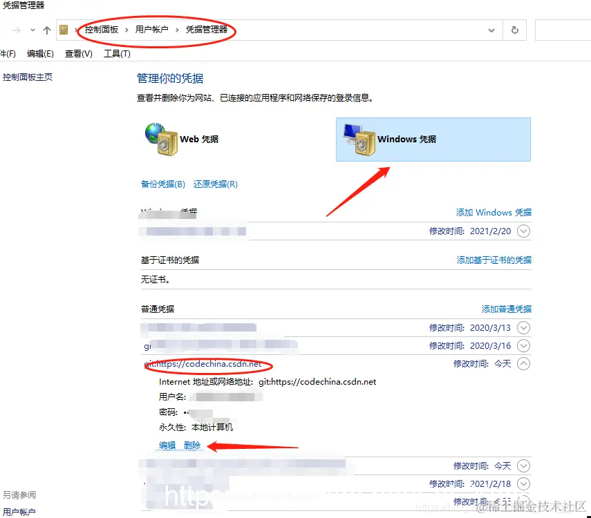 如果想要重新用git登录code china 在windows凭据里面删除相关信息