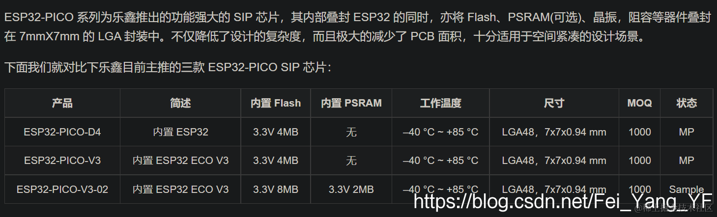 乐鑫最新推出的ESP32进化版ESP32-PICO-D4,这是一个Sip封装的模块,是在ESP32的基础上进一步提高了集成度,甚至集成了4MB的SPI Flash,但外观看起来仍旧像是一颗IC,而且尺寸只有7mm*7mm*0.94mm,因此可以给用户节省不少PCB空间,特别适用于任何空间有限或电池供电的应用,如可穿戴电子产品,医疗设备,传感器和其他IoT产品相关开发参考www.cirmall.com/articles/19…