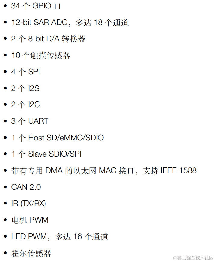 ESP32时钟速率比一般的stm32要快,引脚没有stm32多,ESP32的外设种类基本和stm32多,但数量没有那么多,也就一个外设一对接口,但是可以引脚复用;ESP32内置霍尔效应传感器和内置温度传感器