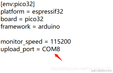 选择下载串口号,根目录下找到platformio.ini,修改如下图