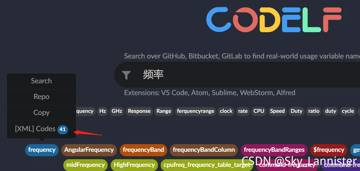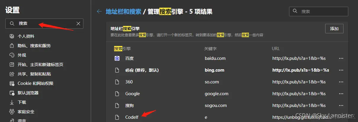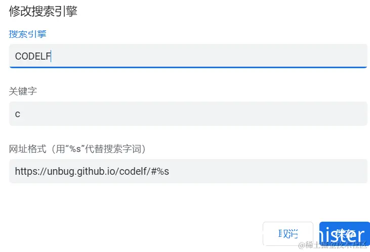使用CODELF Sky_Lannister 2022-05-02 350 阅读1分钟 CODELF是对代码中名字进行命名的工具 使用方法如下: 在浏览器中找到搜索引擎 然后添加或修改搜索引擎: 之后在浏览器地址栏,输入关键字后,点一下Tab,输入要搜索的变量名字即可,搜索结果如下图 点击箭头处可以找到调用这个变量的相关代码