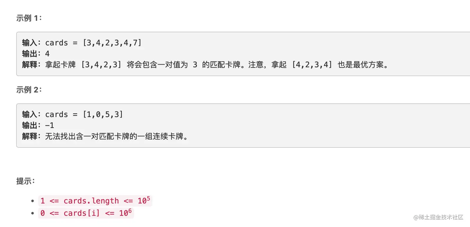 返回你必须拿起的最小连续卡牌数,以使在拿起的卡牌中有一对匹配的卡牌。如果无法得到一对匹配的卡牌,返回 -1 。