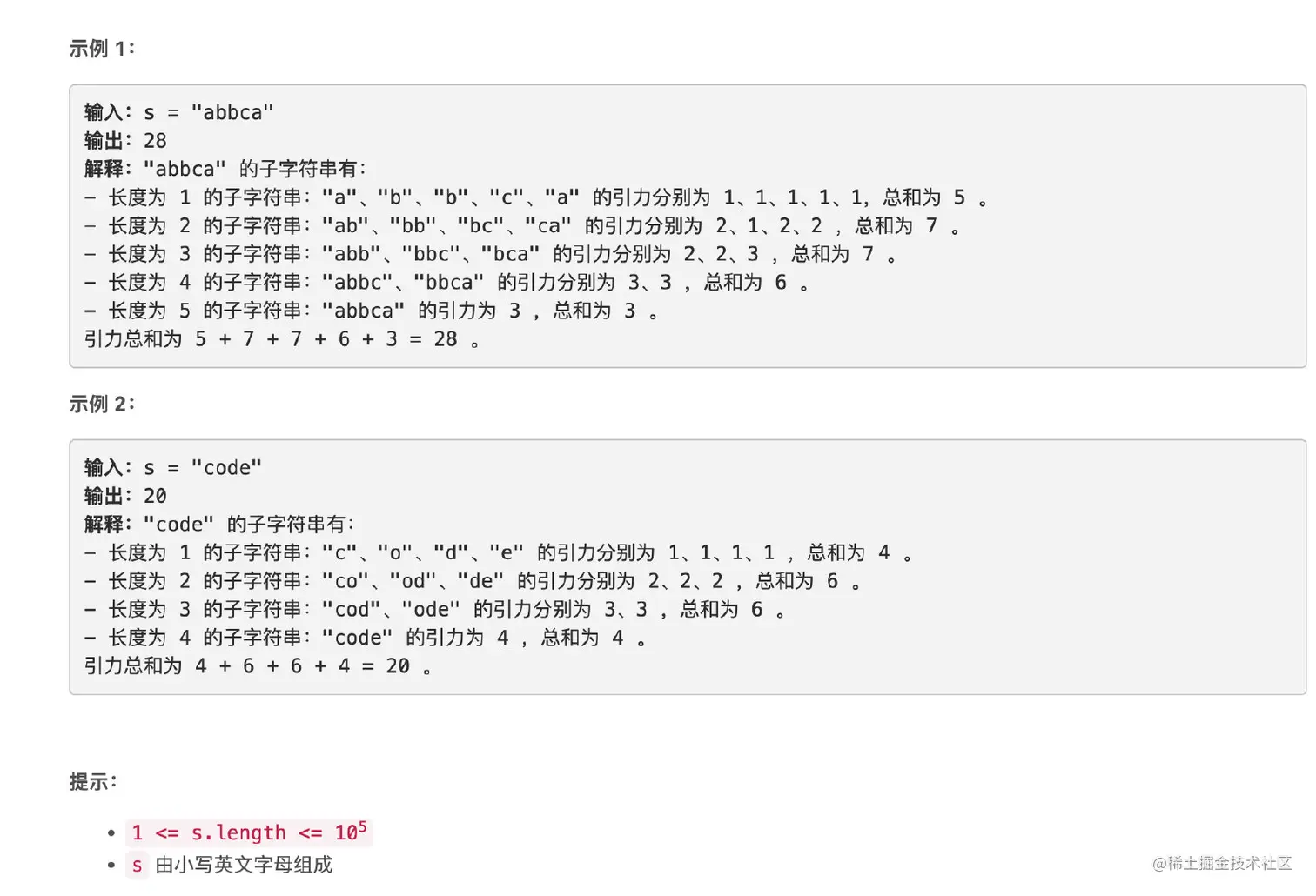 - 例如,"abbca" 的引力为 3 ,因为其中有 3 个不同字符 'a'、'b' 和 'c' 。