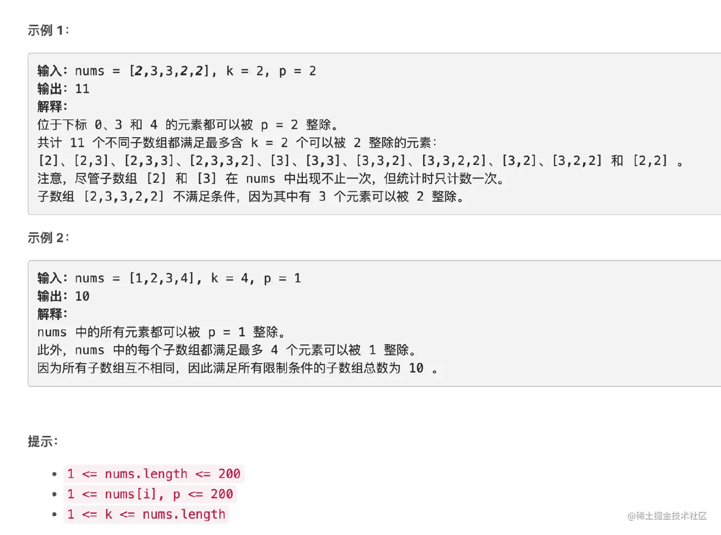 一开始的时候我不小心把题目看错了,看漏了子数组必须连续的条件,如果不看错题意的话,其实思路并不算难想。因为题目给的范围很小,我们要找到所有被p整除数量小于k的子数组,我们大可以枚举出所有的子数组来进行一个一个地判断。