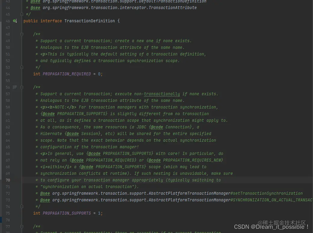 Spring事务的传播行为一共有7种,定义在spring-tx模块的Propagation枚举类里,对应的常量值定义在TransactionDefinition接口里,值为int类型的0-6。