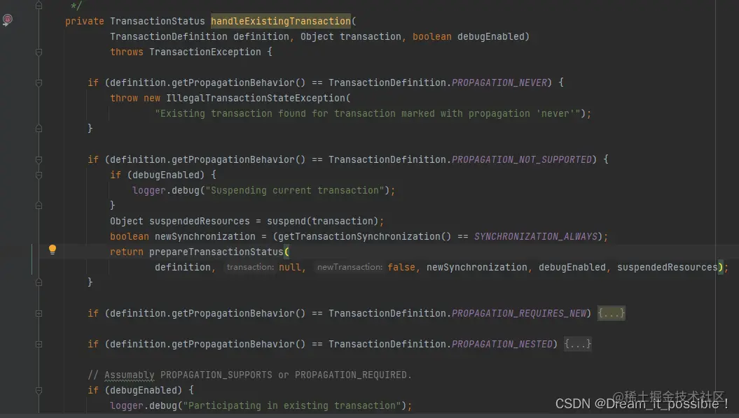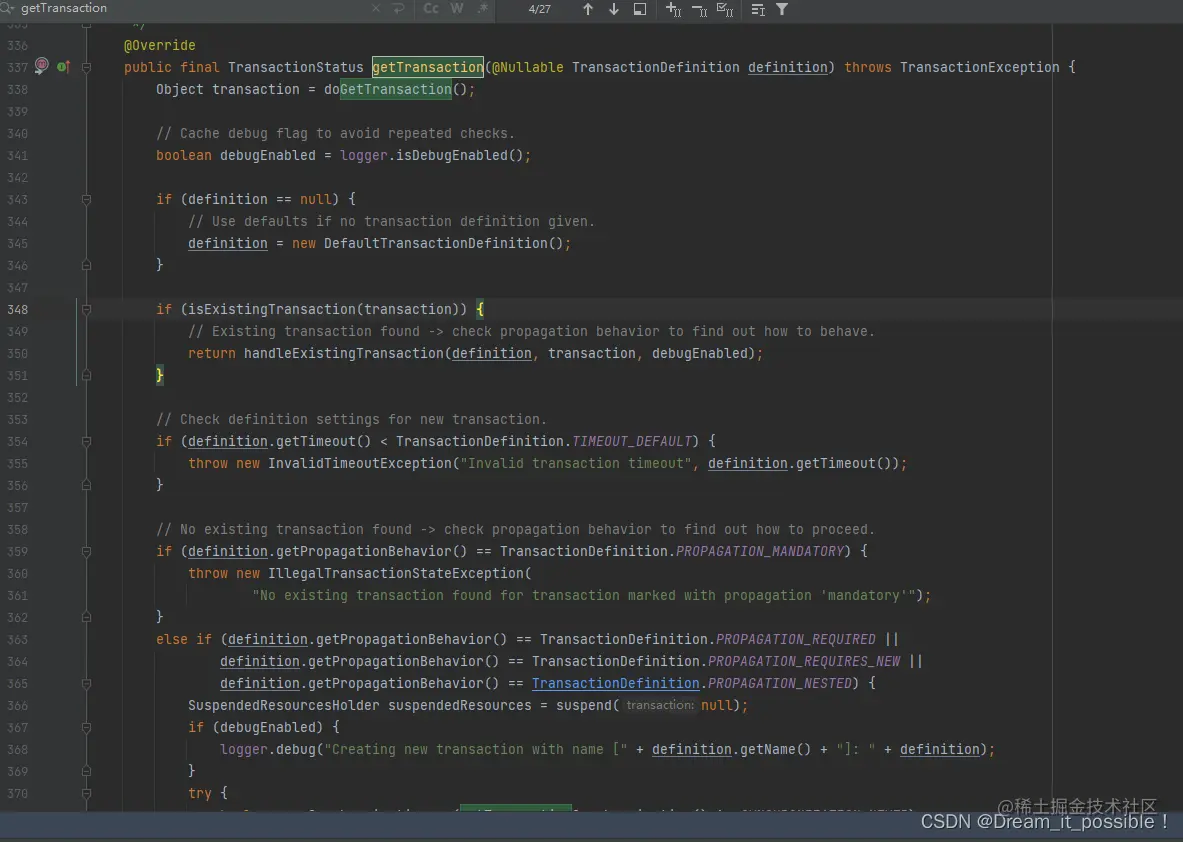 为了更深入了解Spring 事务的传播规则,跟一下源代码全局搜索getTransaction方法,进入到AbstractPlatformTransactionManager类里的 getTransaction(@Nullable TransactionDefinition definition)
