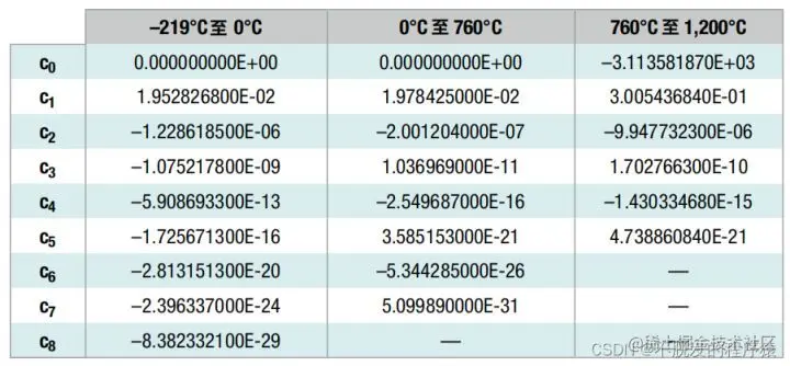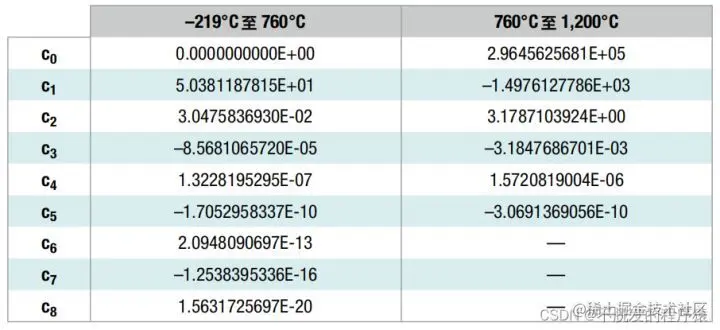 针对5阶RTD电阻至温度换算的系数如下表所示: