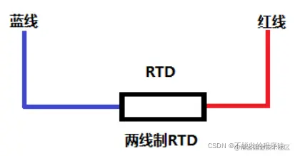 两线制RTD的引线是直接在电阻的两端引出两条导线到测温模块上。测温模块采用电桥平衡的原理,RTD作为电桥的一个臂进行测量。两线制RTD的示意图如下所示: