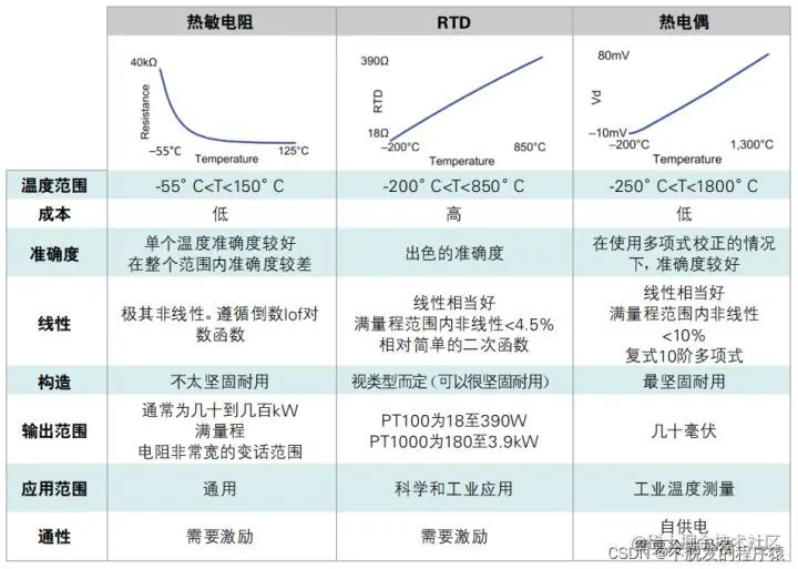 总结热敏电阻、RTD、热电偶的区别可参见下表所示: