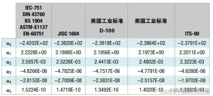 针对不同RTD标准的Callendar-Van Dusen系数如下表所示: