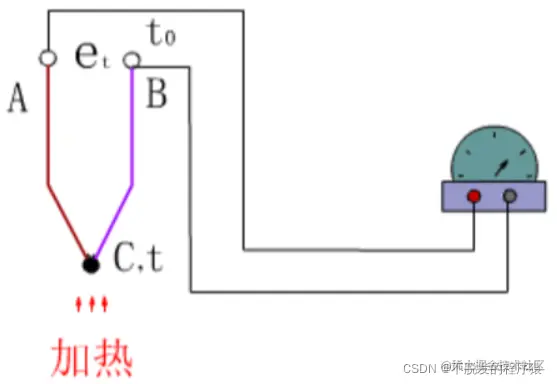 通过下图理解热电偶的工作原理,用两种不同颜色表示两种不同的金属材料,A、B端在常温环境中用于测温端口,称为冷端,在C端进行加热。由于热电效应,在 A端和C端以及B端和C端之间温度不同,所以会产生电势差。而因为两种金属材料的不同,会导致这两个电势差不一样,最终导致了A端和B端也有了电势差,通过测量这两个端的电势差,根据热电效应的线性关系就可以得出A(B)端 和C端的温差。再通过一个已知温度的校准值和两种金属的线性系数,就可以计算出任意输出电势差对应的温度值了。